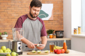 Zdjęcie "Mężczyzna robi zdrowe smoothie w domu" może być wykorzystywane do celów osobistych i komercyjnych zgodnie z warunkami zakupionej licencji Royalty-free. Obraz jest dostępny do pobrania w jakości wysokiej rozdzielczości do 5760x3840.