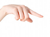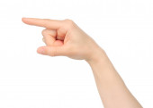 Piękna kobieca ręka wskazująca lub dotykająca czegoś. Odizolowana na biało ze ścieżką wycinania