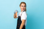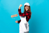 Zdjęcie "Malarka nad odizolowanym niebieskim tłem wykonująca gest telefonu. Oddzwoń." może być wykorzystywane do celów osobistych i komercyjnych zgodnie z warunkami zakupionej licencji Royalty-free. Obraz jest dostępny do pobrania w jakości wysokiej rozdzielczości do 5760x3840.