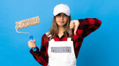 Zdjęcie "Malarka na odizolowanym niebieskim tle ma wątpliwości podczas patrzenia w górę" może być wykorzystywane do celów osobistych i komercyjnych zgodnie z warunkami zakupionej licencji Royalty-free. Obraz jest dostępny do pobrania w jakości wysokiej rozdzielczości do 5760x3840.