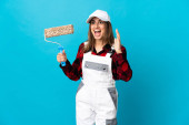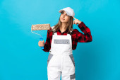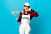 Malarka na odizolowanym niebieskim tle pokrywającym usta dłońmi