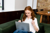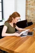 Selektywne skupienie kobiety patrząc na laptopa, trzymając tosty z dżemem przy stole