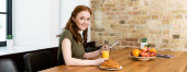 Piękna kobieta uśmiecha się do kamery trzymając tosty z dżemem w kuchni
