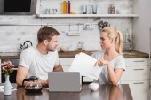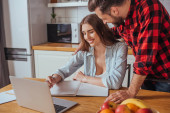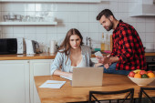 wysoki kąt widzenia człowieka siedzi na stole i pokazuje smartfon do poważnej dziewczyny pracującej na laptopie