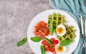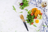 Śniadanie. Grecka sałatka i gotowane jajka. Świeża sałatka warzywna z pomidorami, ogórkami, oliwkami, rukolą i serem feta. Modne jedzenie. Widok z góry, płaski