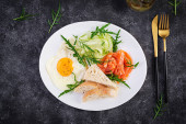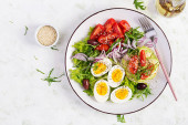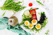 Zdjęcie "Śniadanie. Grecka sałatka i gotowane jajka. Świeża sałatka warzywna z pomidorami, ogórkami, oliwkami, rukolą i serem feta. Modne jedzenie. Widok z góry, płaski" może być wykorzystywane do celów osobistych i komercyjnych zgodnie z warunkami zakupionej licencji Royalty-free. Obraz jest dostępny do pobrania w jakości wysokiej rozdzielczości do 5760x3840.