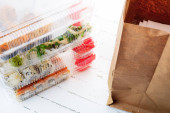 Zdjęcie "Zbliżenie sushi w pudełku zdrowej żywności dostawy usług online. Dziewczyna posiada 2 zestawy sushi w rękach. Kuchnia japońska: bułki, sos sojowy, wasabi. 1 + 1 ogłoszenie dla restauracji" może być wykorzystywane do celów osobistych i komercyjnych zgodnie z warunkami zakupionej licencji Royalty-free. Obraz jest dostępny do pobrania w jakości wysokiej rozdzielczości do 5760x3840.