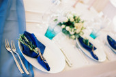 Zdjęcie "Urodziny serwowane niebieski stół przed selekcją. Przygotowanie stołu banguet z niebieskimi białymi serwetkami w restauracji. Stół świąteczny" może być wykorzystywane do celów osobistych i komercyjnych zgodnie z warunkami zakupionej licencji Royalty-free. Obraz jest dostępny do pobrania w jakości wysokiej rozdzielczości do 5760x3840.