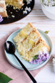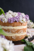 Ciasto biszkoptowe ze śmietaną, impregnowane kokosem i ananasem, ozdobione kwiatami lilii.