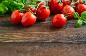 Pomidory wiśniowe z liśćmi bazylii na ciemnym tle łupkowym, pionowe, przestrzeń do kopiowania