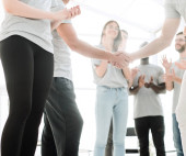 uśmiechnięta dziewczyna stojąca w kręgu z przyjaciółmi.