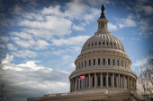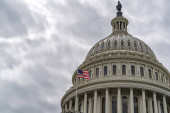 Budynek Kapitolu Stanów Zjednoczonych w Waszyngtonie w letni dzień z flagą powiewającą na wietrze..