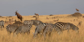 Zdjęcie "Grupa zebr stoi w suchej trawie sawanny. " może być wykorzystywane do celów osobistych i komercyjnych zgodnie z warunkami zakupionej licencji Royalty-free. Obraz jest dostępny do pobrania w jakości wysokiej rozdzielczości do 5760x3840.