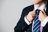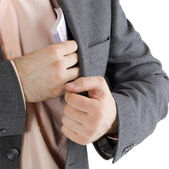 Tułów biznesmena stojącego. Modny klasyczny granatowy garnitur na człowieka przeciwko szaremu ogonowi