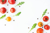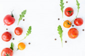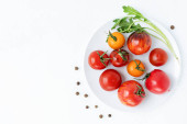 Pomidory wiśniowe na gałązce, zbliżenie na ciemnym grafitowym tle z kopią przestrzeni. Widok z góry.