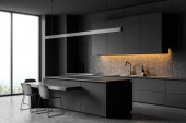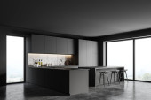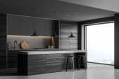 Zdjęcie "Narożnik stylowej kuchni z szarymi i kamiennymi ścianami, szarymi blatami, ciemnymi drewnianymi szafkami i wygodną wyspą z pasztetem z cytrynami stojącymi na nim. Okno z zamazanym widokiem na góry. 3d renderowanie" może być wykorzystywane do celów osobistych i komercyjnych zgodnie z warunkami zakupionej licencji Royalty-free. Obraz jest dostępny do pobrania w jakości wysokiej rozdzielczości do 5760x3840.