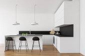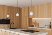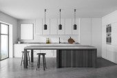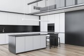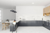 Zdjęcie "Wnętrze nowoczesnej kuchni z szaro-białymi ścianami, szarymi blatami, drewnianymi szafkami, barem ze stołkiem, dwoma piekarnikami i pionową ramą na plakat. 3d renderowanie" może być wykorzystywane do celów osobistych i komercyjnych zgodnie z warunkami zakupionej licencji Royalty-free. Obraz jest dostępny do pobrania w jakości wysokiej rozdzielczości do 5760x3840.