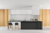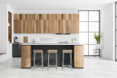Wnętrze nowoczesnej kuchni z szaro-białymi ścianami, szarymi blatami, drewnianymi szafkami, barem ze stołkiem, dwoma piekarnikami i pionową ramą na plakat. 3d renderowanie