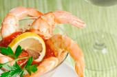 Szklanka wina z sokiem pomidorowym, czerwonym pomidorem i krewetkami pomarańczowymi na czarnym tle