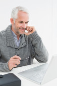 uśmiechający się dojrzały przedsiębiorca korzysta z laptopa na kanapie w salonie