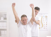 fizjoterapeuta badanie uśmiechnięta dojrzałych mans ramię