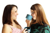 twee jonge vrouwelijke vrienden drinken koffie glimlachen