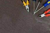 Różne narzędzia do naprawy, zestaw narzędzi do domu, na zabytkowym drewnianym tle, bezpieczna praca dla budownictwa.