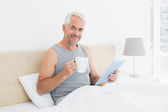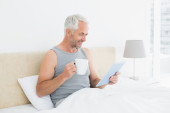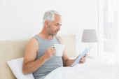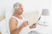 Zdjęcie "człowiek z cyfrowy tablicowy picia kawy w łóżku" może być wykorzystywane do celów osobistych i komercyjnych zgodnie z warunkami zakupionej licencji Royalty-free. Obraz jest dostępny do pobrania w jakości wysokiej rozdzielczości do 5760x3840.