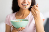 Zdjęcie "uśmiechnięta młoda kobieta jedzenie zbóż w kuchni" może być wykorzystywane do celów osobistych i komercyjnych zgodnie z warunkami zakupionej licencji Royalty-free. Obraz jest dostępny do pobrania w jakości wysokiej rozdzielczości do 5760x3840.
