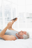 uśmiechający się dojrzały przedsiębiorca korzysta z laptopa w łóżku