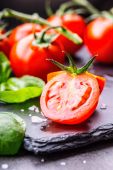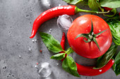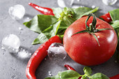 całe i kawałki dojrzałych czerwonych pomidorów, papryka chili, zielone gałązki bazylii, czosnek, przyprawy, cebula, kostki lodu na czarno, widok z góry, zbliżenie
