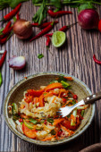 Zdjęcie "Sałatka z języka wołowego z warzywami, papryką chili i świeżymi ziołami. Strzał z bliska" może być wykorzystywane do celów osobistych i komercyjnych zgodnie z warunkami zakupionej licencji Royalty-free. Obraz jest dostępny do pobrania w jakości wysokiej rozdzielczości do 5760x3840.