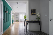 Panorama salonu z białymi i zielonymi ścianami i drewnianym stołem