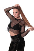 Młoda kobieta w czarnych błyszczących legginsach i bluzce netto na białym tle