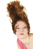 Młoda uśmiechnięta kobieta z bardzo długimi latającymi włosami na białym tle