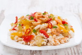 ryż z warzywami i krewetek, szczegół, na białym tle
