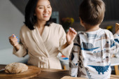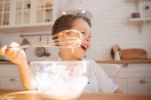 Mama z synem gotuje na tle jasnej kuchni. Dziecko pomaga rodzicom ugniatać ciasto do pieczenia w warunkach samoizolacji.Chłopiec podniósł trzepaczkę.