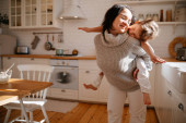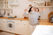 Zdjęcie "Mama z synem gotuje na tle jasnej kuchni. Dziecko pomaga rodzicom ugniatać ciasto do pieczenia w warunkach samoizolacji.Chłopiec podniósł trzepaczkę." może być wykorzystywane do celów osobistych i komercyjnych zgodnie z warunkami zakupionej licencji Royalty-free. Obraz jest dostępny do pobrania w jakości wysokiej rozdzielczości do 5760x3840.