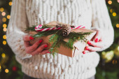 Boże Narodzenie lub Nowy Rok pudełko prezentów w rękach kobiety.