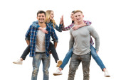 Trójka przyjaciół zabawia się wózkiem na białym tle