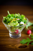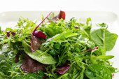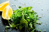 Mieszane organiczne mikro zieleniny kiełki w szkle z kroplami wody na ciemnym tle.Młody rzeżucha świeżej wody i kiełki czerwonej jarmużu. Zdrowy sposób żywienia