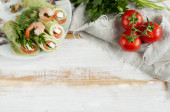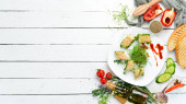 Pyszne gotowane kanapki z jajkiem serwowane na białym drewnianym stole, płaskie nioski. Miejsce na tekst