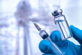 ampułka, szklane fiolki i strzykawka medyczna ze szczepionką przeciw koronawirusowi na niebieskim tle