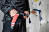 Zdjęcie "Bliżej na środku bjj brazylijski jiu jitsu czarny pas ręce trzymając i zawiązać wokół talii sportowca w niebieskim kimono gi stoi przed ścianą" może być wykorzystywane do celów osobistych i komercyjnych zgodnie z warunkami zakupionej licencji Royalty-free. Obraz jest dostępny do pobrania w jakości wysokiej rozdzielczości do 5760x3840.