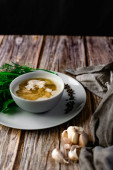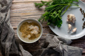 Zupa z puree i ziemniakami. Ozdobiona zieloną cebulą i groszkiem z małych ziaren ze słoika. Podawanie w ceramicznym garnku na zwęglonym drewnianym tle z tkaniną i naturalnym drewnem