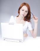 portret rudowłosa dziewczyna z laptopa na plaży.