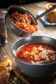 Czerwona zupa z warzywami i mięsem, smaczny, tradycyjny ukraiński barszcz, zbliżenie, płytka głębia ostrości, selektywne skupienie. Zdrowa ekologiczna koncepcja żywności domowej roboty