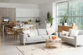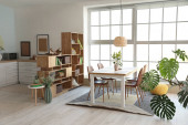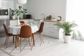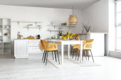 Zdjęcie "Wnętrze nowoczesnej kuchni ze stylowym stołem" może być wykorzystywane do celów osobistych i komercyjnych zgodnie z warunkami zakupionej licencji Royalty-free. Obraz jest dostępny do pobrania w jakości wysokiej rozdzielczości do 5760x3840.