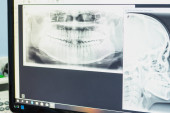 Dentysta badający panoramiczne prześwietlenie zębów na laptopie