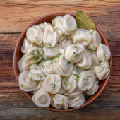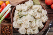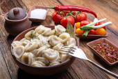 domowe pierogi z kwaśną śmietaną i koperkiem na drewnianym stole vintage ze świeżymi pomidorami, cebulą i przyprawami w stylu rustykalnym